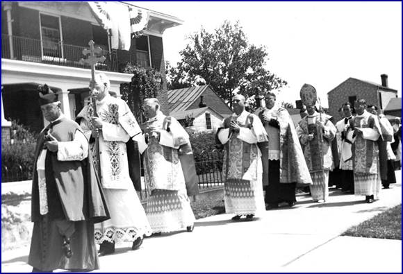 Centennial Mass Procession Rev. James Hermes, O.M.C., Rev. John F. Knue, Rev. John M. Abell, Most Rev. Archbishop John A. Floersh, Rev. Delfin Autheman, Rev. David Rummage, Rev. James Lehmann. |