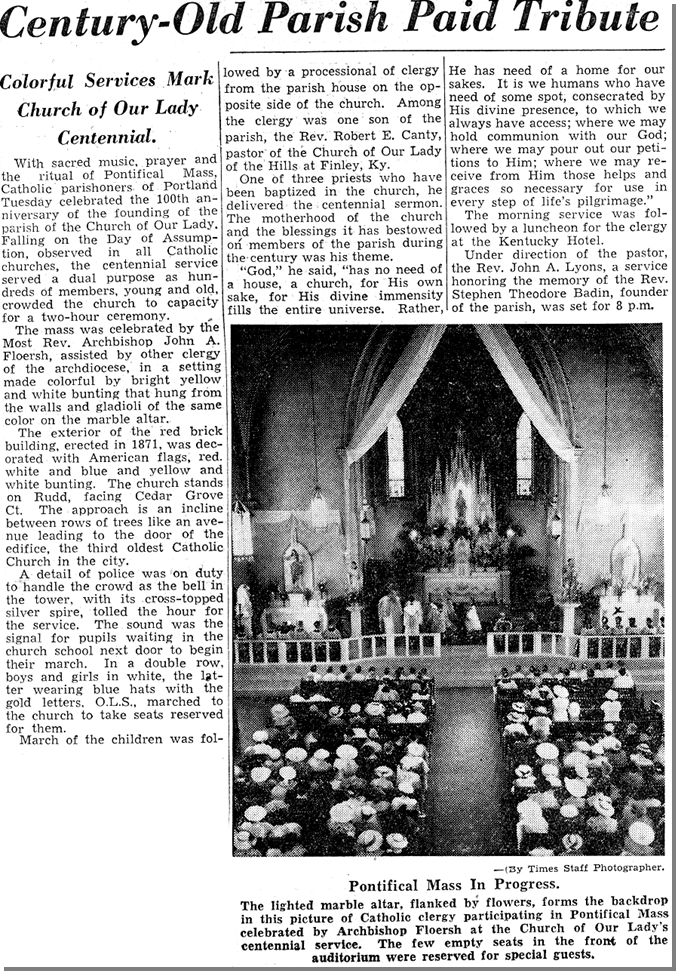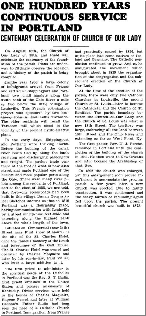 Next Tuesday, August 15, Feast of the Assumption of the Blessed Virgin into heaven, will also mark the centenary of the founding of the third parish established in Louisville, the Church of Our Lady, located in that western section of the city known as Portland. Thus Our Lady in heaven rejoices with its parishioners in the completion of a hundred years of fruitful labor, a hundred years of happy devotion and honor to the blessed mother of God.
