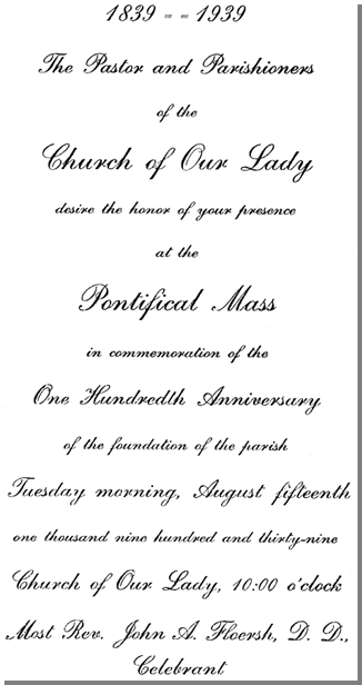 It was on the Feast of the Assumption, August 15, 1839, that the Holy Sacrifice of the Mass was offered for the first time in the newly–formed parish. So it deemed most fitting that the Church of Our Lady celebrate the one hundredth anniversary of the foundation of the parish on this glorious Feast Day. The following editorial appeared in The Record in the preceding week: