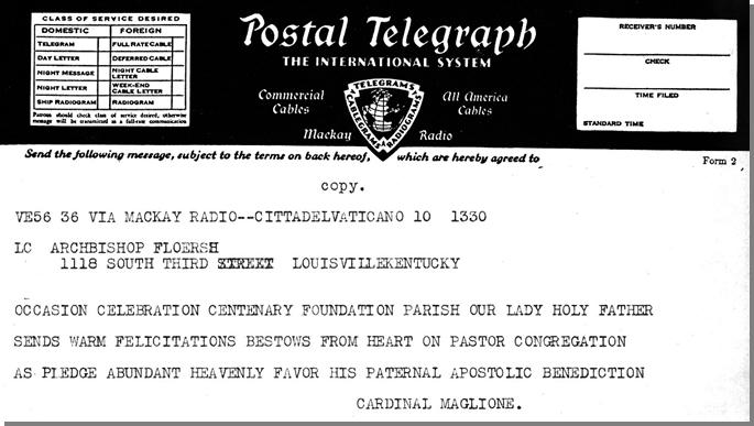 On the occasion of the celebration of the centenary of the foundation of Our Lady’s parish, the Holy Father sends warm felicitation, and bestows from his heart on the pastor and congregation, as a pledge of abundant heavenly favor, his paternal apostolic benediction.